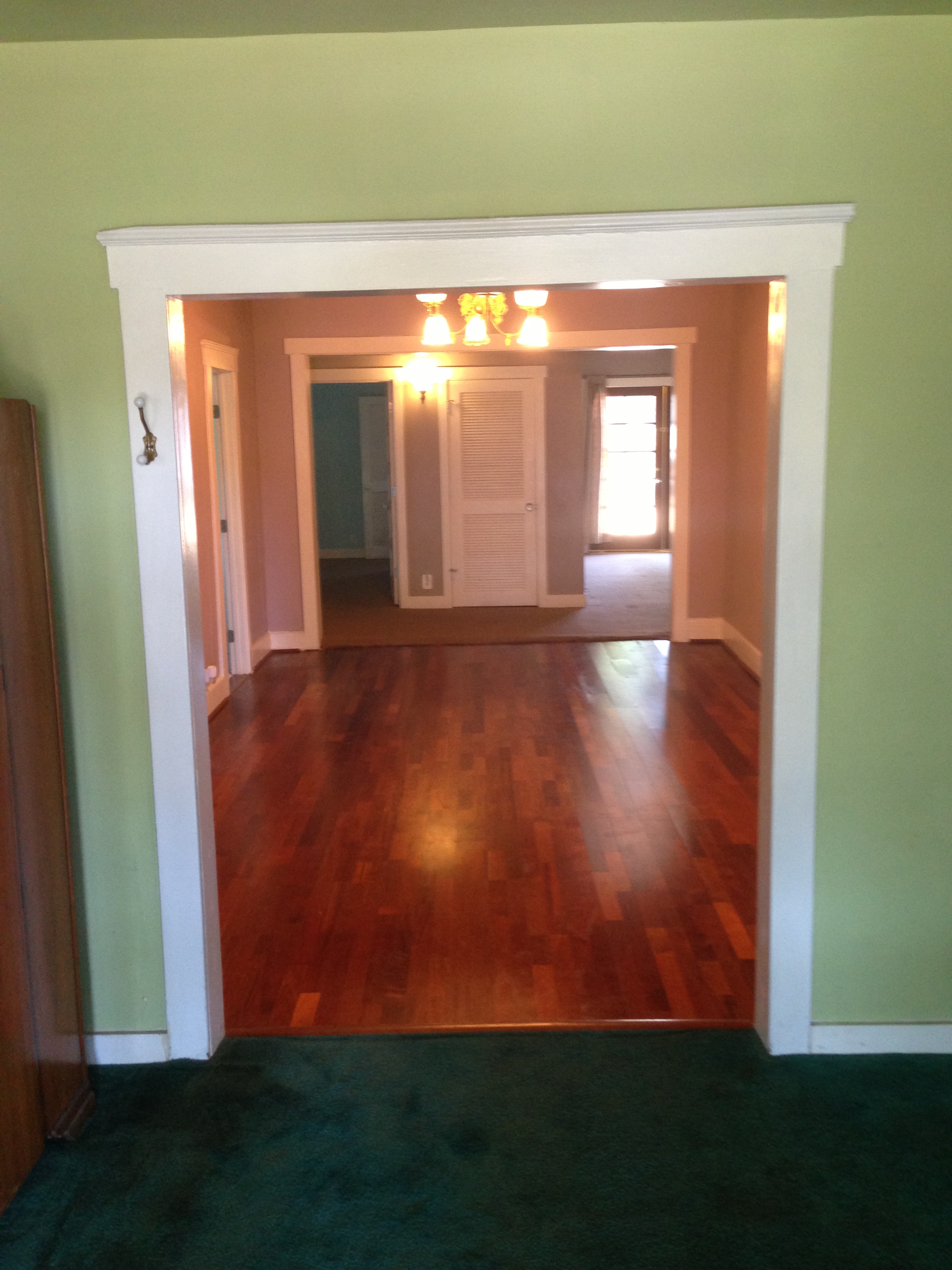 Dining Room – looking from the front door. *Don’t let those shiny wood floors fool you, they are severely sloped and uneven.