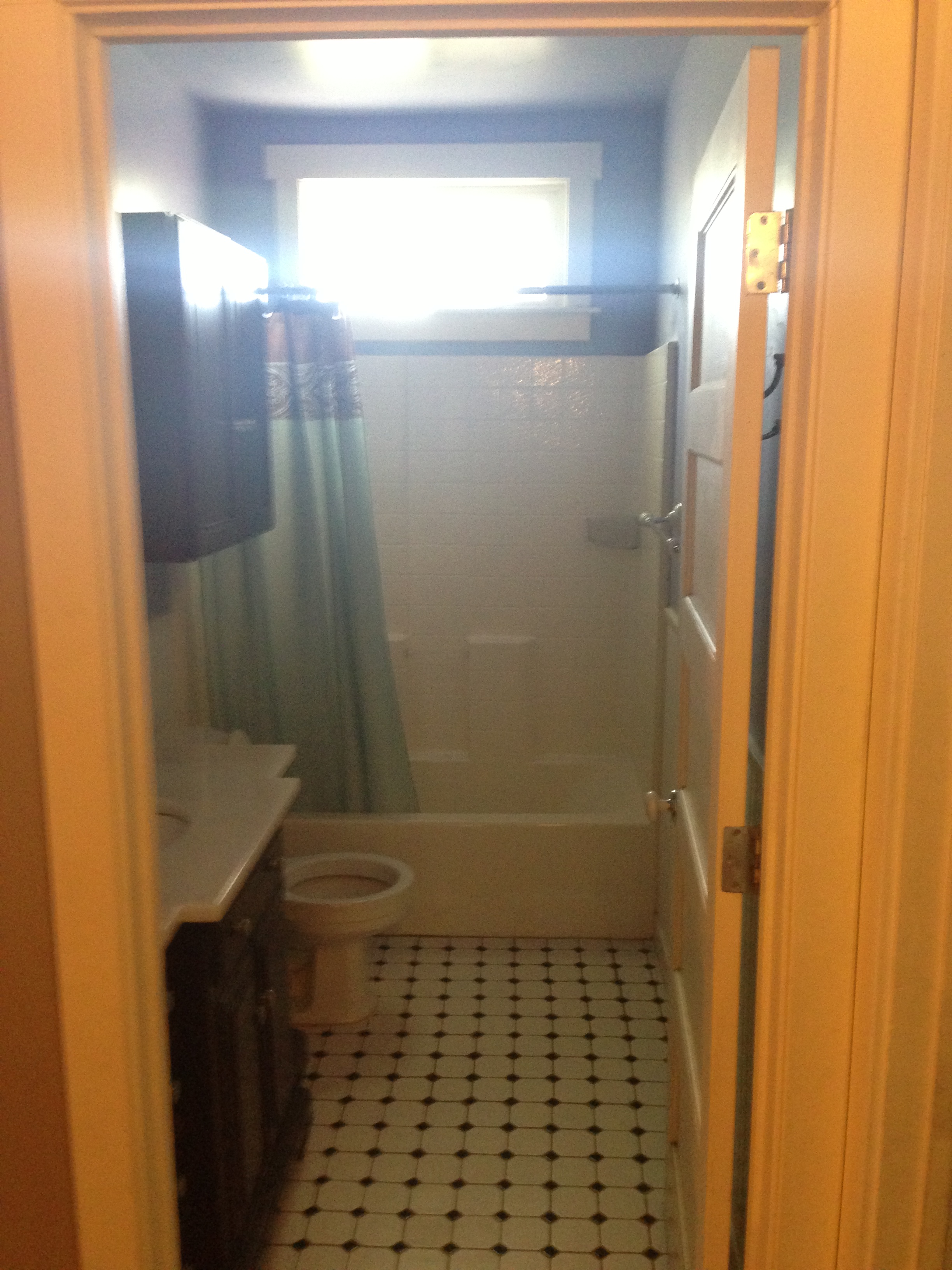 Master Bathroom – looking from the family room in. No that’s not an optical illusion, the tiles are just not straight π