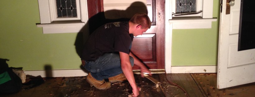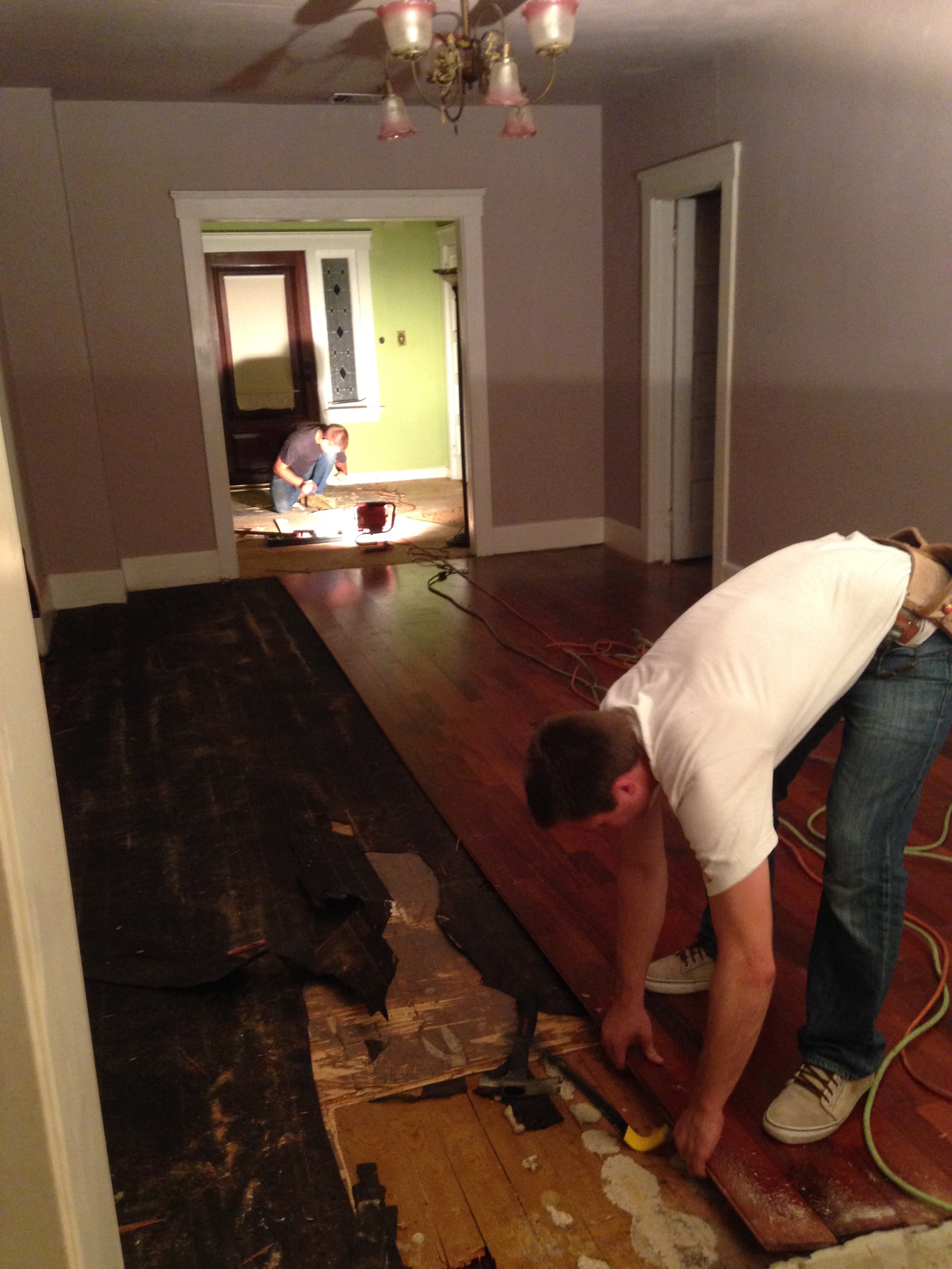 We didn’t waste any time. Right after work we headed over to the house to begin planning for this massive renovation project that we just took on. The first thing Kevin did was pull out his knife and begin ripping out the old green carpet in the living room and the uneven, sloping wood floors in the dining room. Our mom’s began cleaning the dirty shutters… but how cool that the house came with new windows and plantation shutters? Can’t complain about that!
