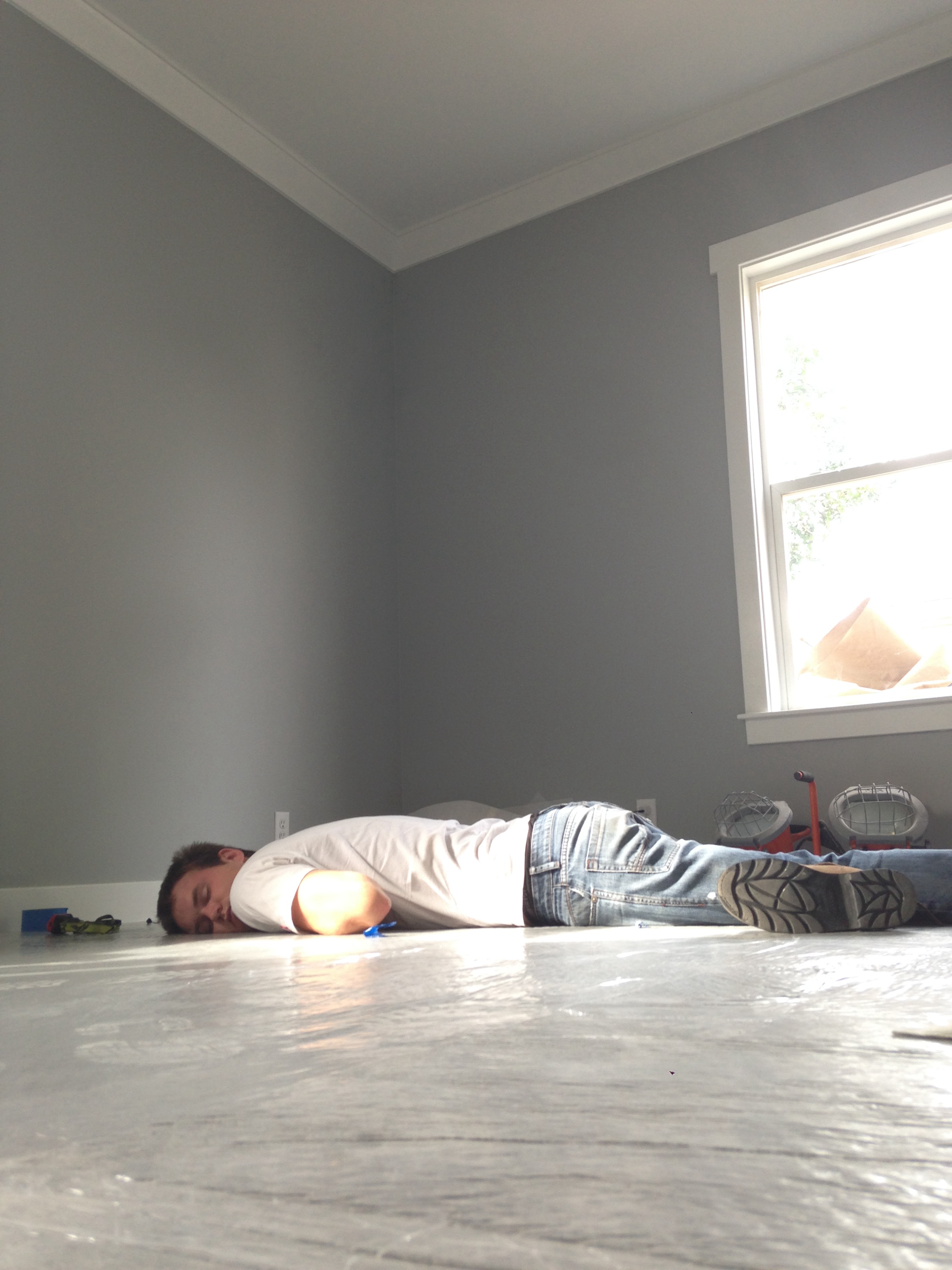 No furniture in the house means naps must be taken on the new carpet. Ok by us! Plastic is still laid that's why it's so shiny.