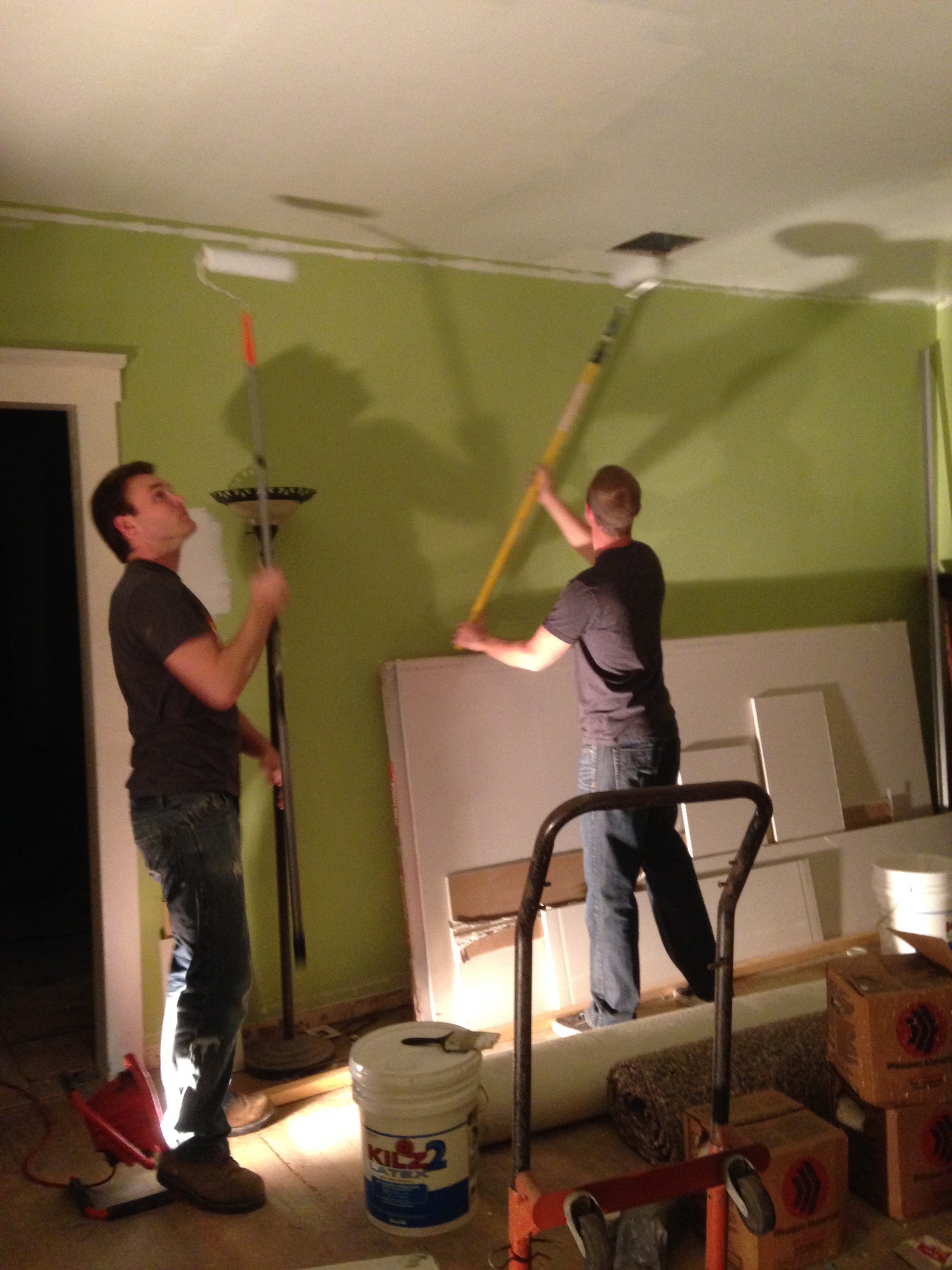 Today Kevin and Timmy primed more of the walls and ceiling for paint. You wouldn’t believe how much primer… and time… it takes to cover these crazy colors. They also began skim coating the nursery 🙂 walls with mud to help get a more even texture. The nursery bedroom is one of the original bedrooms and it has plaster walls that are very uneven and messy looking.
