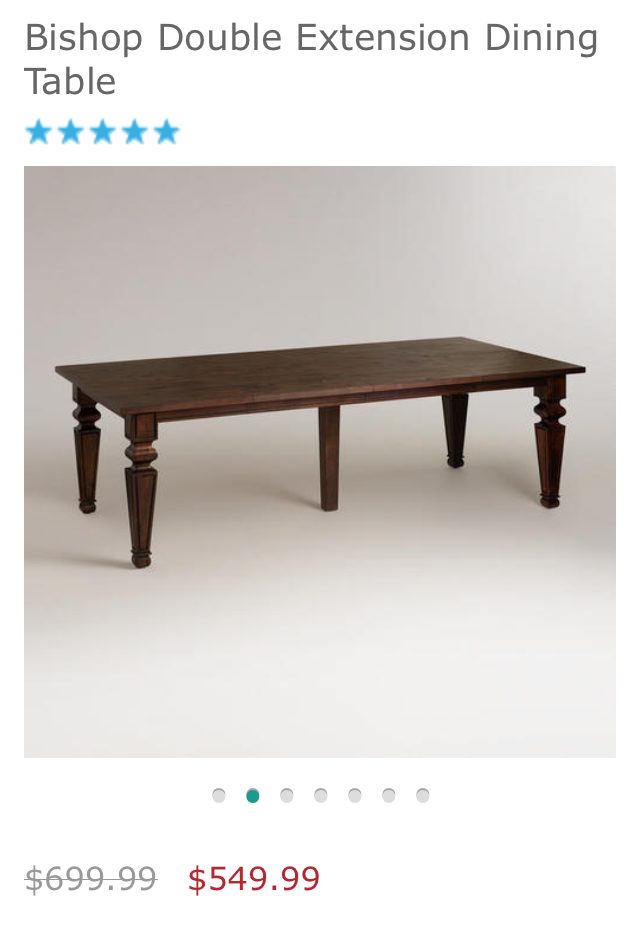 Today we bought our dining room table HERE from World Market: Cost Plus for a great price! They were having a 15% after Christmas Sale today only and we got an additional 10% off for taking a table already out of the box. Woohoo! I love to find good sales.