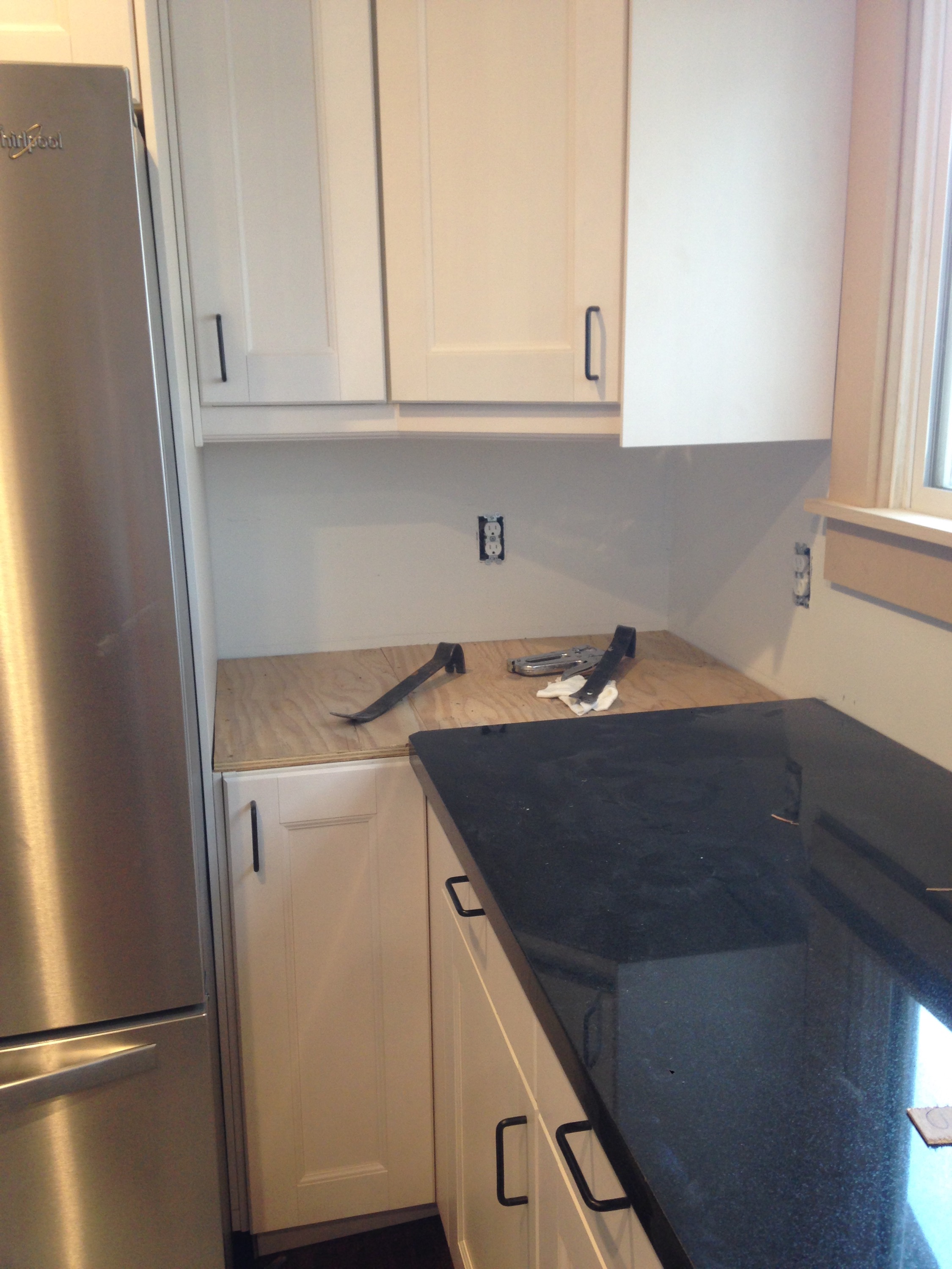 After work today, Timmy and Kevin began installing the white subway tile back splash. They worked so fast! They finished the entire kitchen and even started the grout. Something we learned about grout today… do not let grout sit on your tile longer than 30 minutes without washing it off. Do not. We thought we could cover all of the tile with grout and then go back over later with a wet sponge and smooth it all out. Well you can’t. At least not easily. It was a MAJOR pain and it easily tripled the amount of time it took to finish. We had to sit there with razor blades and chip away at the dried grout and the grout lines are not as smooth as I would have liked them to be. Live and learn.