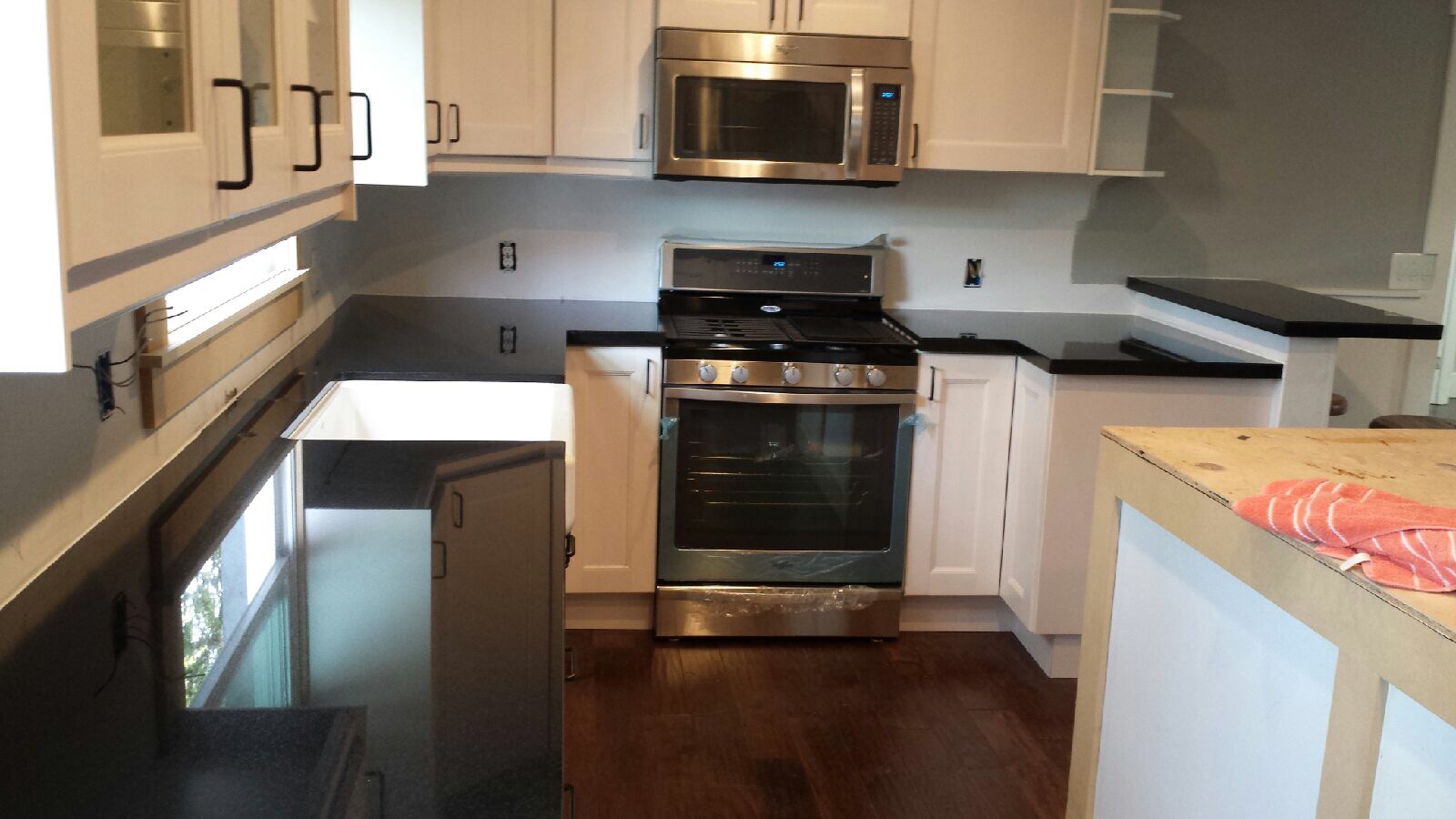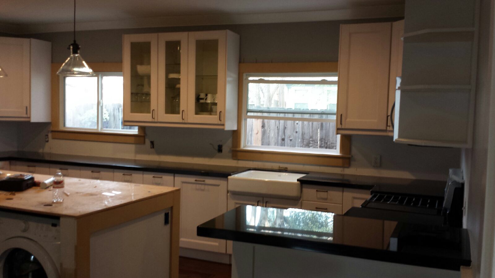 Today our granite was installed! I am so happy with how everything is turning out. My dream counter top would have been a honed black granite (READ MORE ABOUT HONED GRANITE HERE) because it has a more casual feel but it was more expensive. However, I am pleased with how these polished counter tops look. We are almost done with the kitchen!