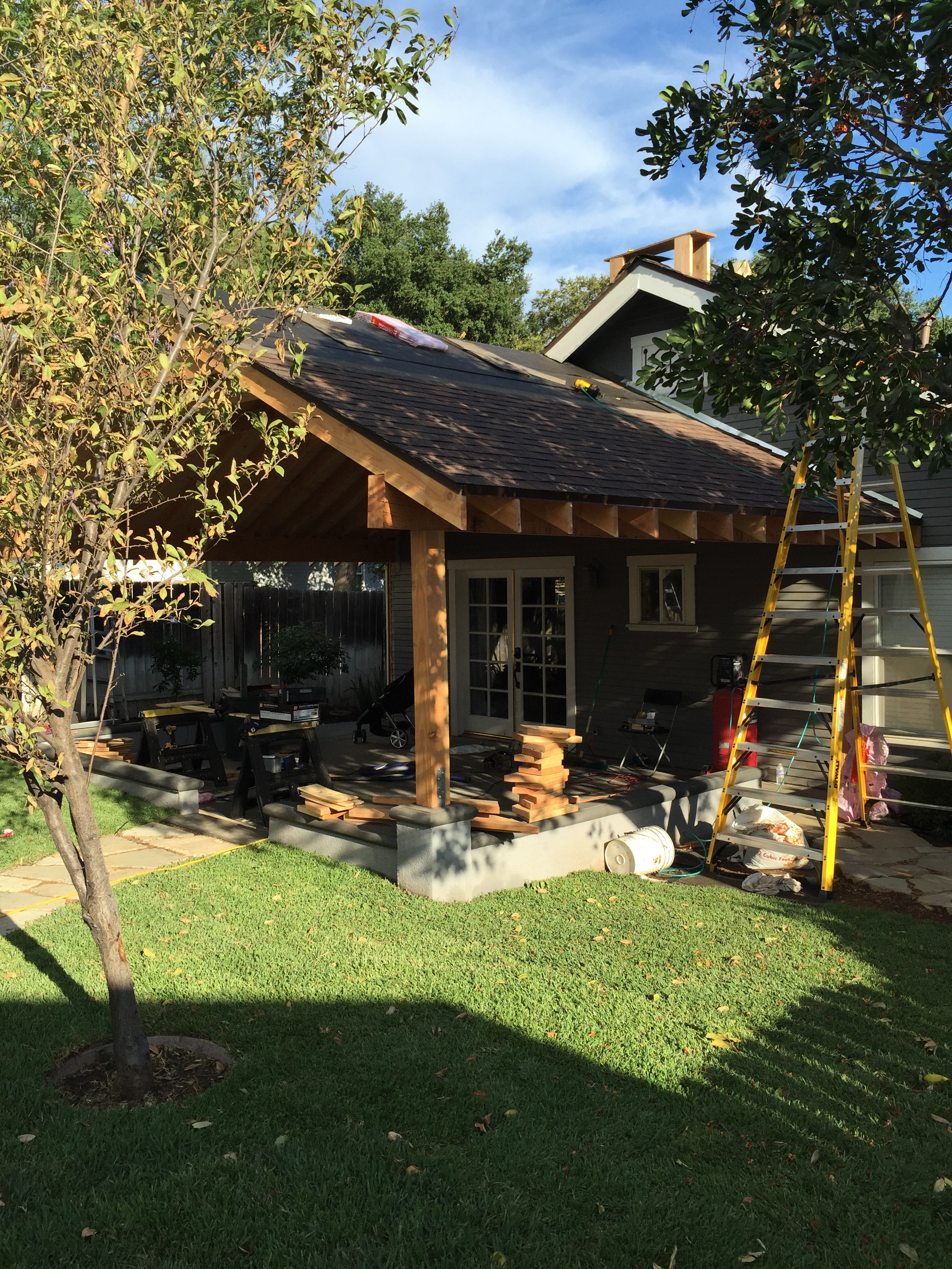 There are a few ways to guarantee rain. 1. Wash your car. 2. Start Roofing. Although drought-stricken California enjoyed a few sprinkles this week, our roofing project did not suffer.  Kevin finished the ship lap sheeting and began laying the shingles the next day. He worked around the clock in the heat to get it done in two days. He was pleased with how relatively fast it went with the new nail gun he purchased. Funny… it seems like we acquire a new tool for every new project we begin…