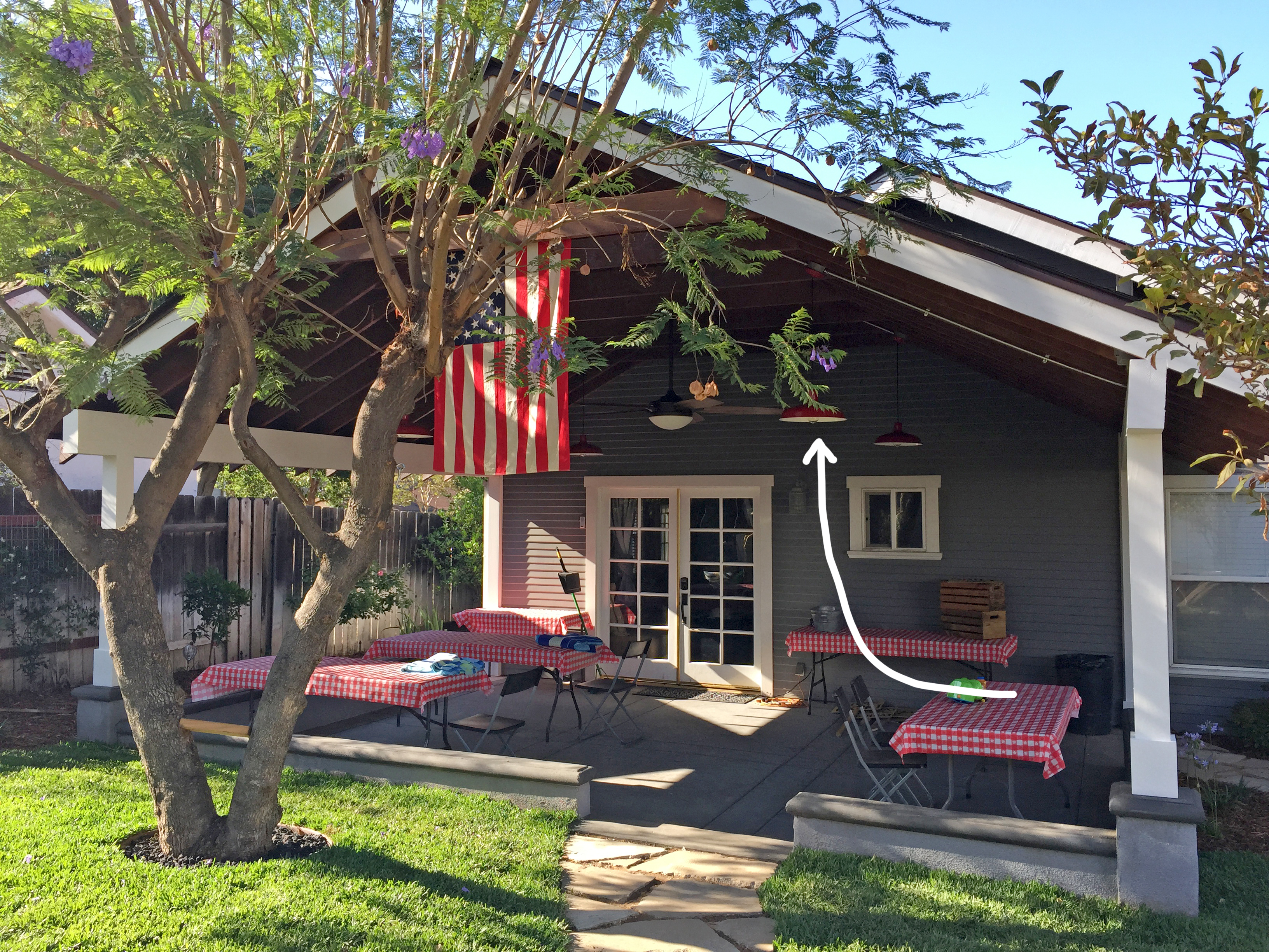 After looking all over the internet for cool patio pendants I finally landed on farm light fixtures. I searched high and low for online retailers and found plenty of good options, however my expensive taste kept getting in the way. I decided to get crafty and spruce up some chrome lights I found at Lowes. Adding the Edison bulbs from Ace Hardware pulled the entire look together.