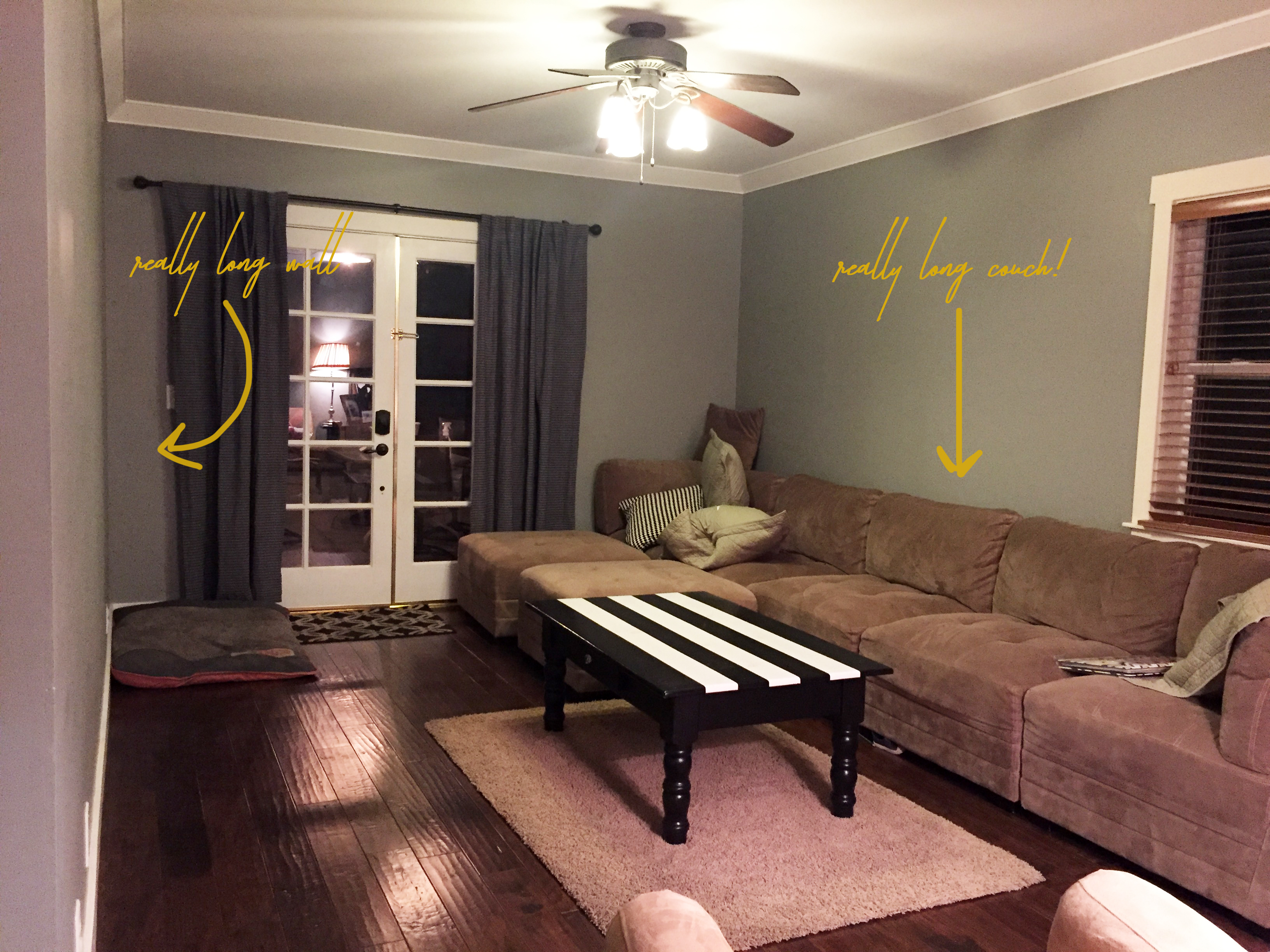 Our family room is a long, rectangular room that had an extremely long couch on one side and long blank wall on the other side. I began perusing Pinterest to find some inspiration to show Kevin. I found a few pictures I liked and he got right to work… and finished it within a few days!