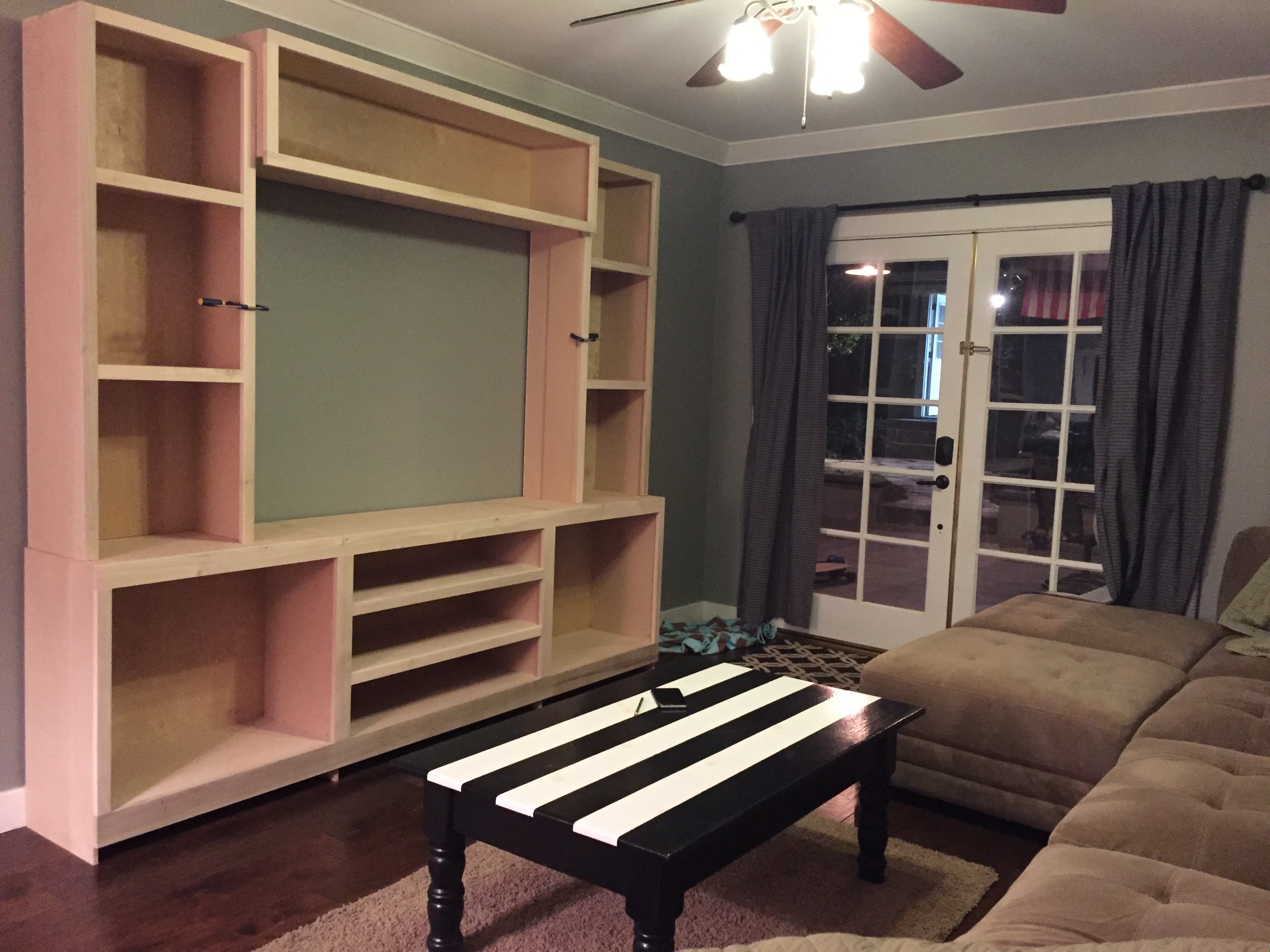 Step 3: affixed to the wall, painted, borrowed a TV for scale, attached frame pieces together