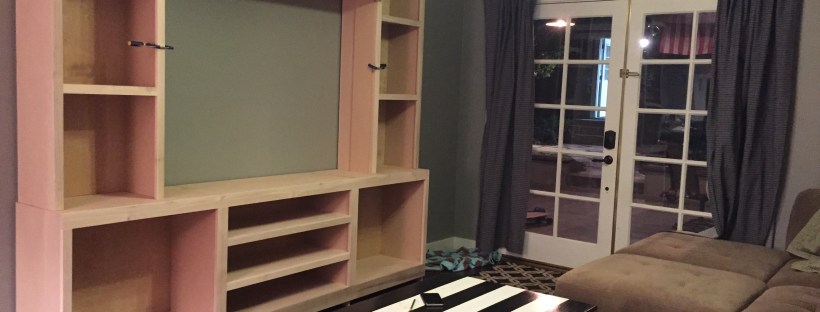 We offered to host Thanksgiving at our house this year. Hosting your first Thanksgiving (well any holiday event really) is a big deal… what should I serve (I’ve never cooked a Turkey!)? How should I decorate my dining table? What should we do afterwards? We decided upon the food, pulled together a few simple decorations, and then tried to figure out what to do afterwards. We came to realize that most people liked to sit around after the big meal, let the tryptophan set in, and watch football (we aren’t big sports fan). However, where would they sit to do that in our house? (Sidenote TV Story: The Christmas before we got married, I bought Kevin a 32″ TV for his bedroom. When we got married, we set it up in our apartment, realized we never watched it so we sold it to some friends. A few years later they wanted to get rid of it and we were living in our house and still didn’t have a TV so we bought it back haha!) The TV now sits on top of a small armoire in our living room. We don’t have cable or even local channels,  we occasionally use it for Apple TV and Netflix. Needless to say, this was not the ideal TV nor location for a big group of people to huddle around. So we decided that this was a better time than ever to build the entertainment center that we always wanted to.