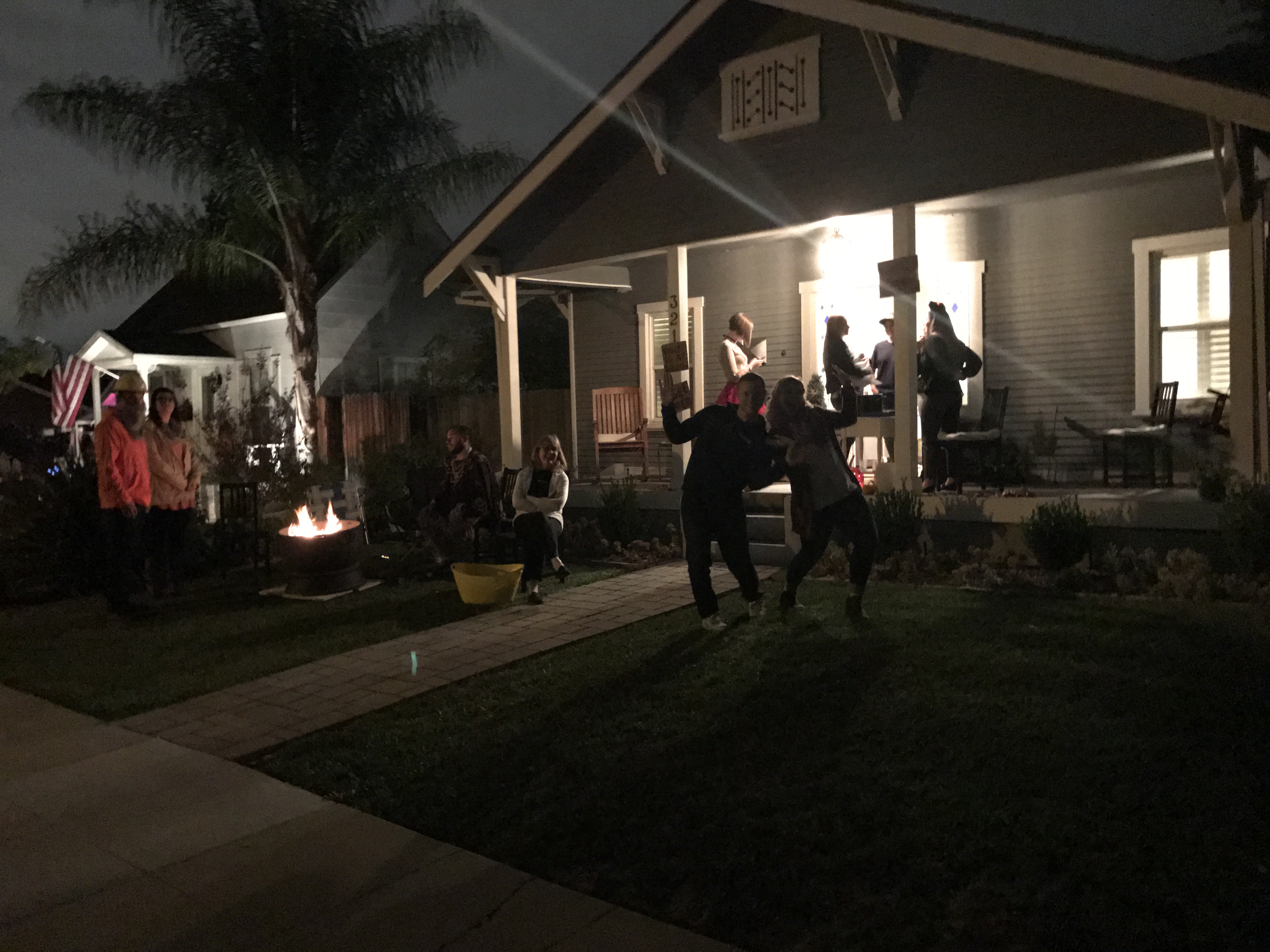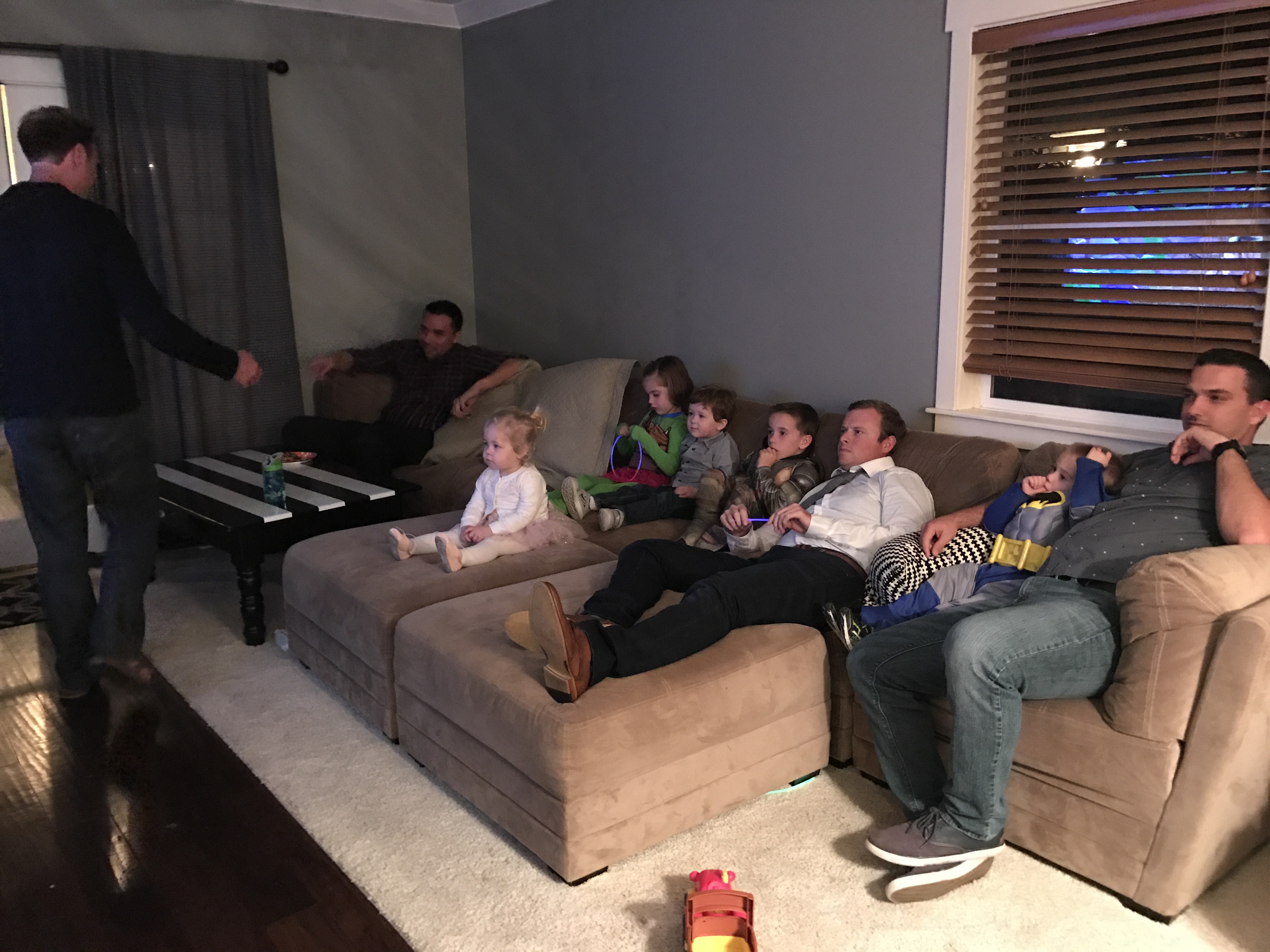 So after this exciting conversation we were then ushered down the street to our home and taken to our back patio. Side note: I really appreciate all the effort the Trading Spaces crew did to make this a 100% true surprise. Covering all the windows, walking us through the alley, covering our eyes, not talking about the houses in front of us etc. Paige explained with emphasis the importance of not blowing the surprise by opening our eyes too soon. She reminded us that there are very few times in our adult lives that we get to be genuinely surprised… so don’t ruin it! We followed her instructions and were carefully guided through the house into the living room where she finally allowed us to open our eyes! I. Was. Shocked. It was this weird feeling of being misplaced. The room had changed so much that I momentarily forget where I was. It felt like we were standing in the lobby of some trendy, boutique hotel. What a transformation! I instantly loved it, the meaningful details like the recreating of the family picture on the porch and using the sidewalk planks around the fireplace, the fresh greenery, the new layout… SO good! When the cameras went off we walked back into the kitchen and there was the dream-team crew (with Nate & Jeremiah still there… I was afraid they had left early and that we weren’t able to say our thanks and goodbyes) greeting us! The excitement in the air was tangible. I wish I could have bottled that up, because it could have sustained me for years to come haha. We then got to walk over to the Jacobsen’s house, hide in the kitchen, and listen as they entered their room and delighted over their new space. When we were able to run out and see them, my excitement was at 200%. 1) We got to work with the best designers ever. 2) We just had a great conversation with Nate. 3) We absolutely loved our room and were so grateful for the Jacobsens. 4) We were so glad they liked their room. 5) We absolutely loved this entire experience. I probably looked a little too enthusiastic but I couldn’t contain my excitement.